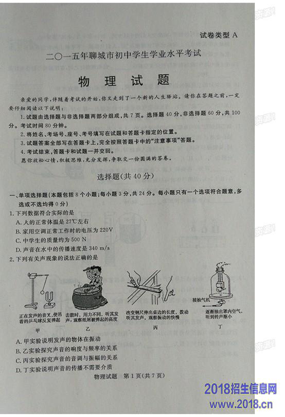 2015山东聊城中考物理试题及答案(图片版)