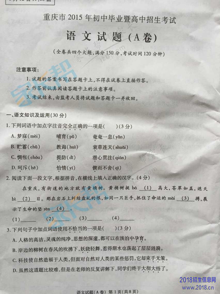 2015年重庆中考语文A卷试题及答案(图片版)