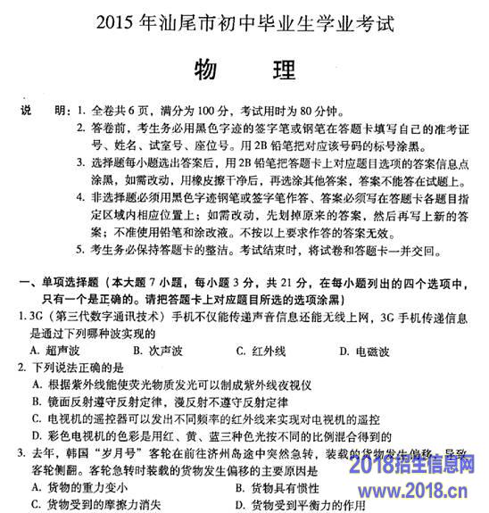 2015年广东汕尾市中考物理试题
