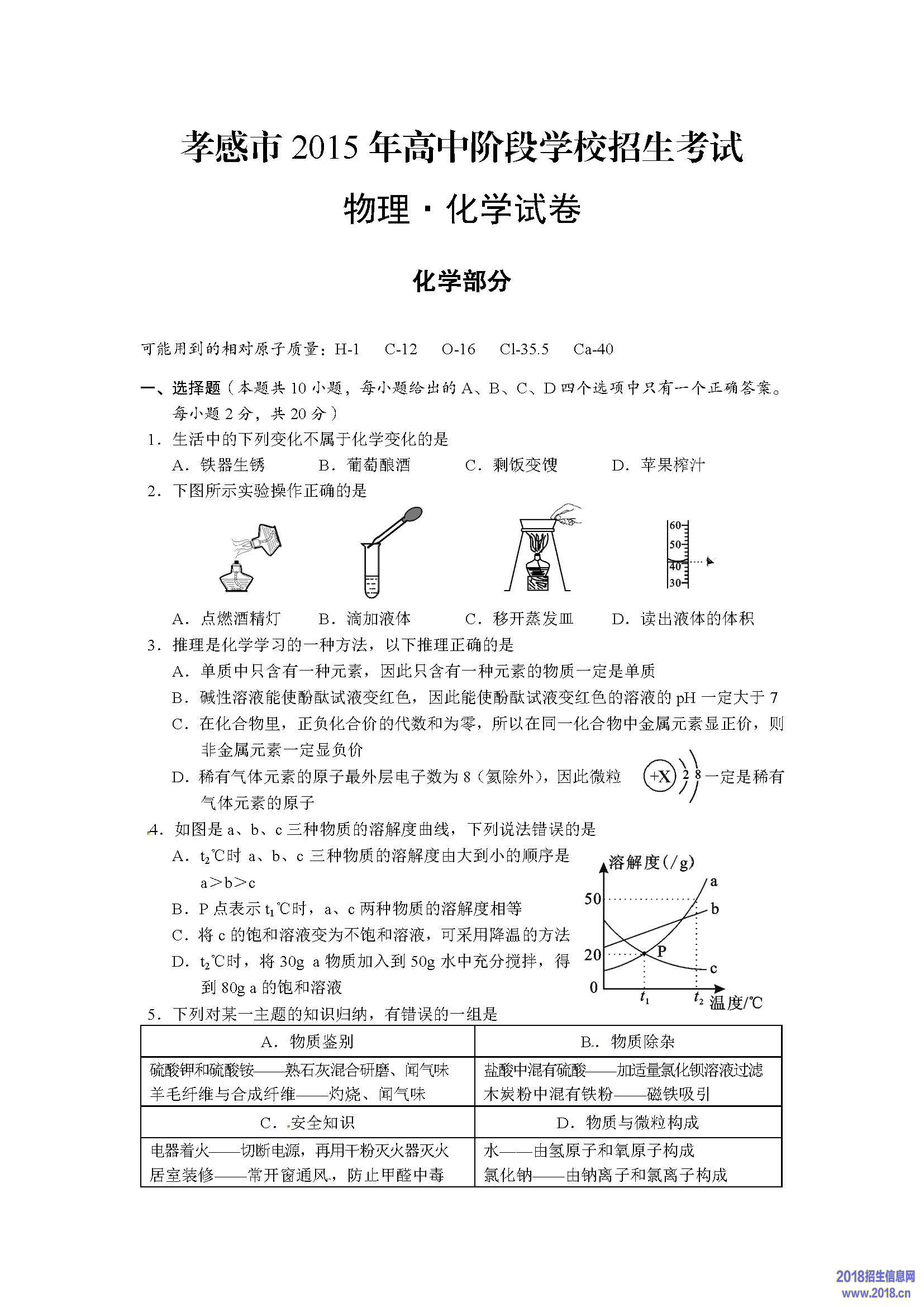 2015年湖北省孝感中考化学试题及答案(图片版)