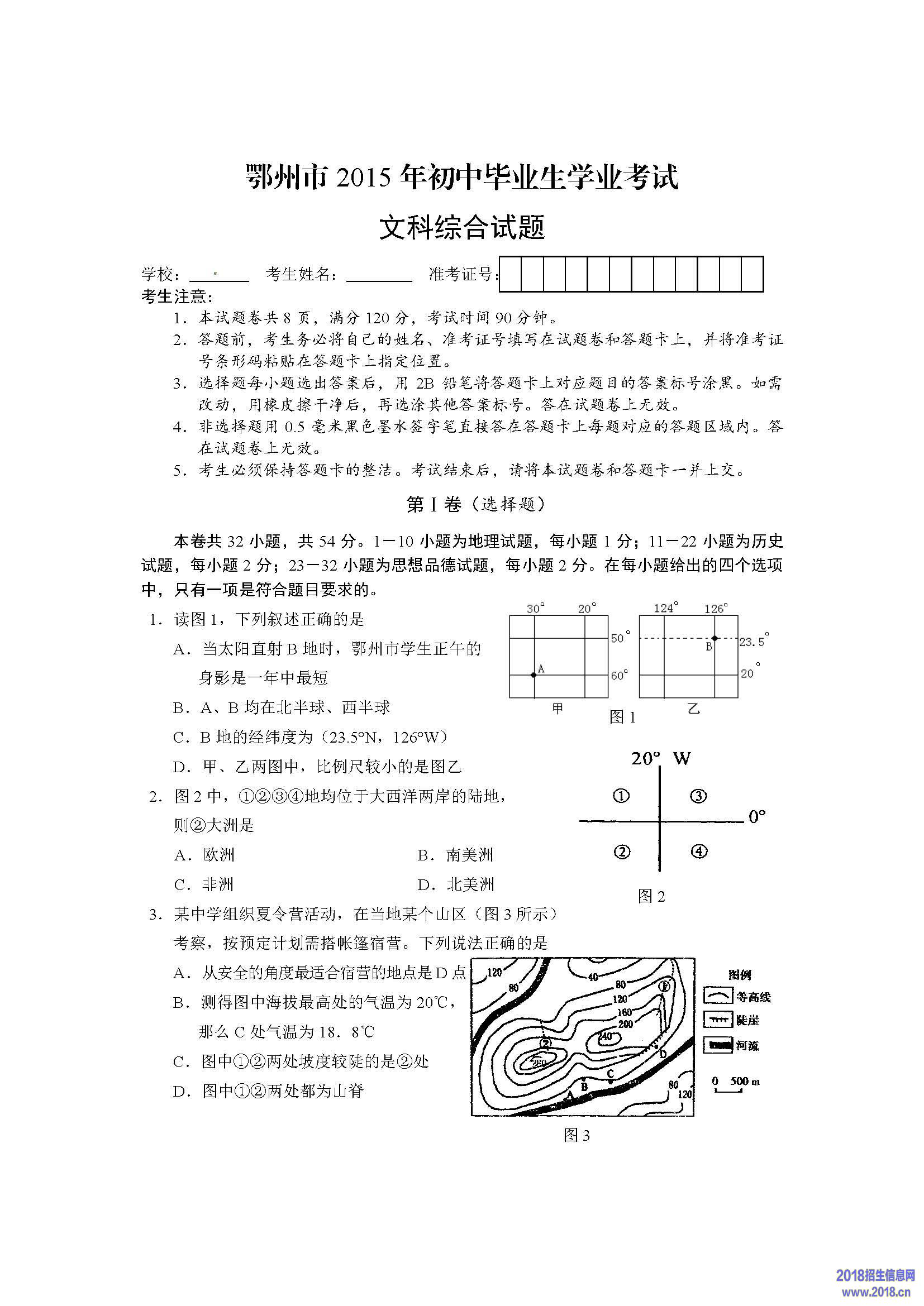 2015湖北省鄂州市中考文综试题及答案(图片版)