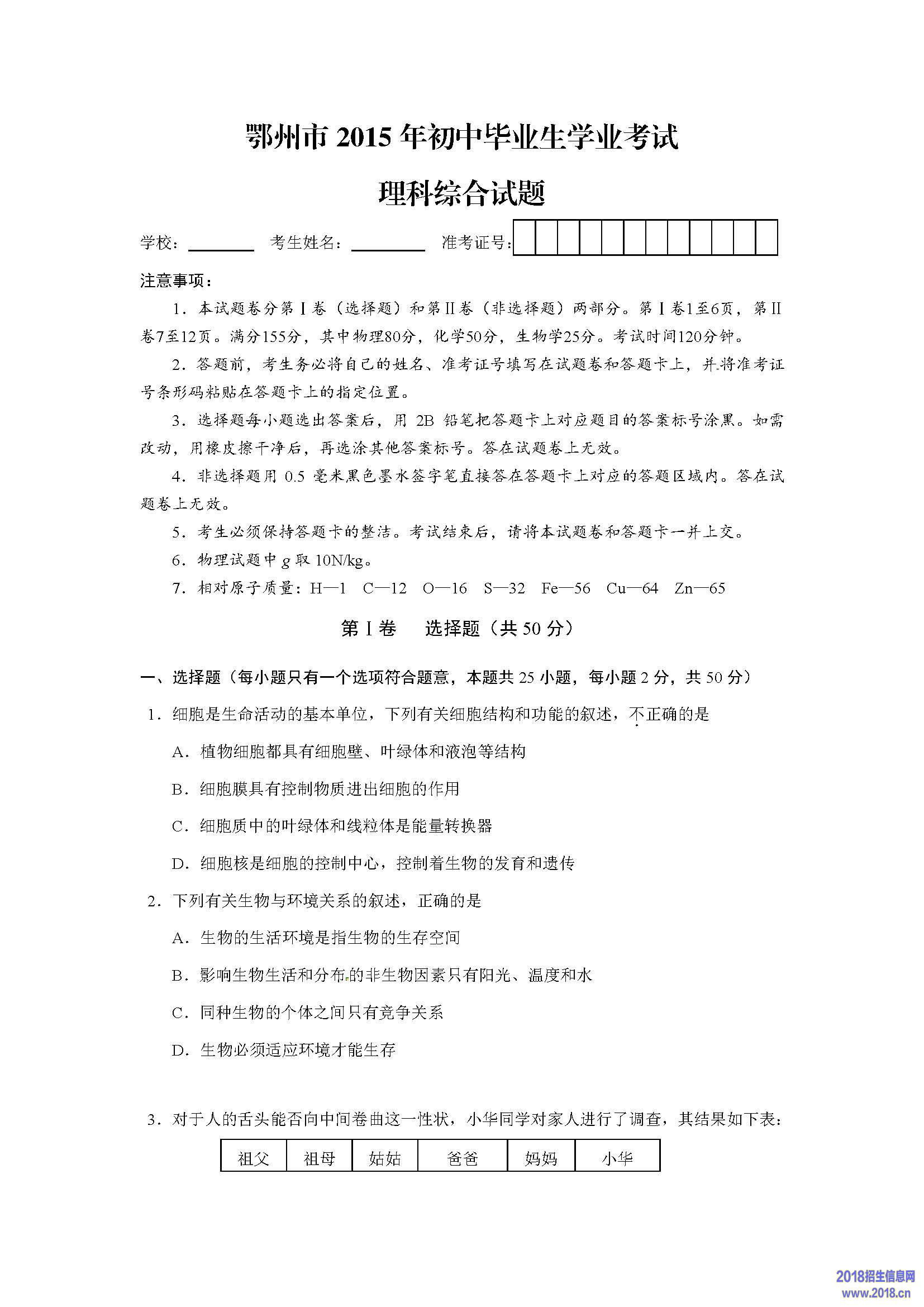 2015湖北鄂州中考理综试题及答案(图片版)