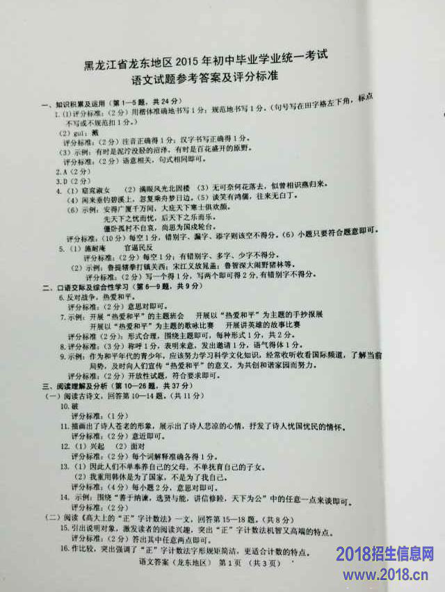2015年黑龙江省龙东地区中考语文试题(word版,答案扫描)
