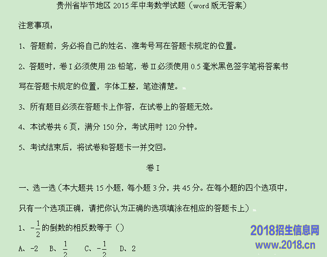 2015年贵州省毕节地区中考数学试题(图片版无答案)