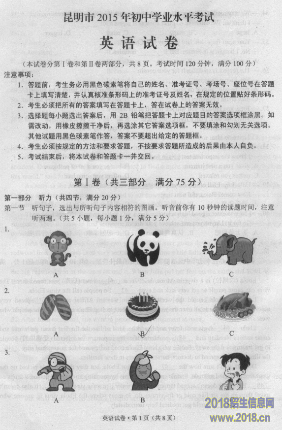 2015年云南省昆明市中考英语试题(扫描版,含答案)