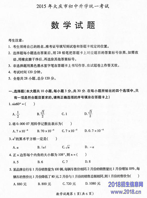 2015年黑龙江省大庆市中考数学试题(扫描版无答案)