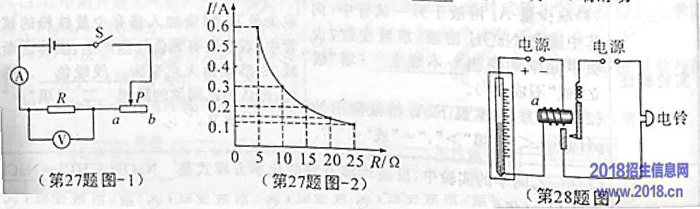27.(3分)图-1是小强“探究通过导体的电流与电阻的关系”的实验电路(电源电压保持不变),图-2是他依据测得的实验数据绘制的电流I随电阻R变化的图像。由图像可知R两端的电压为_______V;当R的电阻由10Ω更换为15欧时,闭合开关后,为使R两端的电压________(选填“改变”或“不变”),滑动变阻器的滑片应向______(选填“a”或“b”)端滑动。