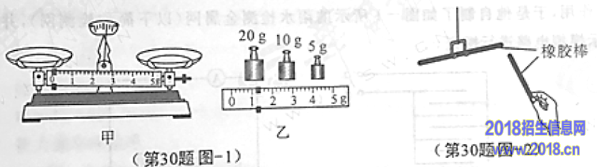 30.(4分)⑴如图-1甲所示,用放置在水平台面上的天平衡量物体质量时,要使天平横梁水平平衡,应将平衡螺母向______(选填“左”或“右”)调节。图-1乙所示为正确测量物体质量后所用砝码的规格和标尺上游码的位置,则该物体的质量为_____g。