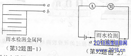 32.(7分)雨天乘车时,小华发现小车前挡风玻璃上的刮水器随着雨的大小,刮动的速度相应地发生变化。雨停后,刮水器自动停止工作。小华查阅相关资料后,发现它的工作电路中安装有“雨水检测金属网”装置。小华想,该装置究竟在刮水器工作中起到了什么作用,于是他自制了如图-1所示的雨水检测金属网(以下简称检测网),并设计了如图-2所示模拟电路进行探究。