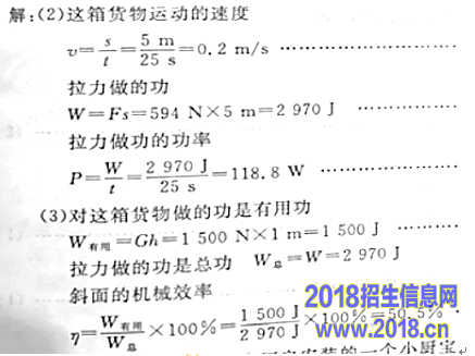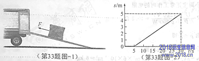 33.(7分)如图-1所示,工人沿斜面把一箱货物从底端拉进车厢。货物移动的距离s与时间t的关系如图-2所示。在此期间,工人拉这箱货物沿斜面匀速运动时的拉力为594N,此斜面的长为5m,高为1m,这箱货物重为1 500N.