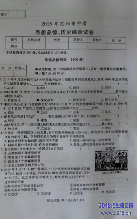 2015年甘肃省定西市中考思品历史试题(图片版)