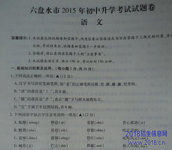 2015年贵州省六盘水中考语文试题(扫描版,无答案)