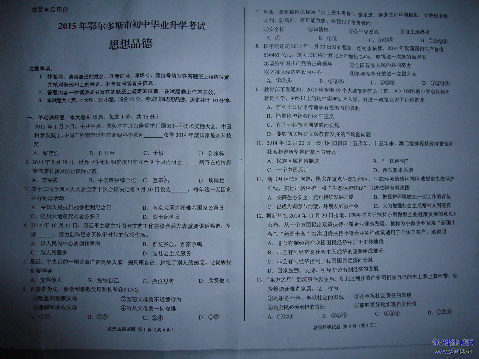 2015年内蒙古鄂尔多斯市中考思想品德试题及其答案