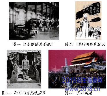 (4)图四反映了五四运动的宏大场面。有学者指出,“五四运动是第一场历史巨变的补课,又是第二次历史巨变的起点”。这里“起点”的含义是什么?请你依据以上材料,概括中国的近代化历程是如何一步步深入的。(5分)