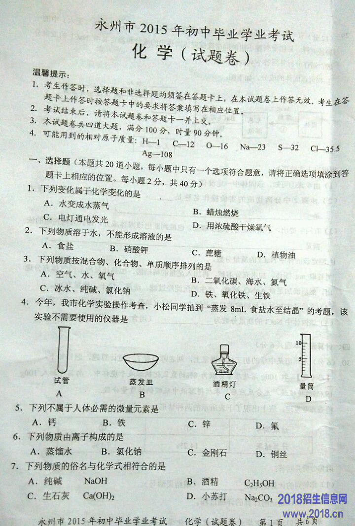 2015湖南省永州市中考化学试题(图片版,无答案)
