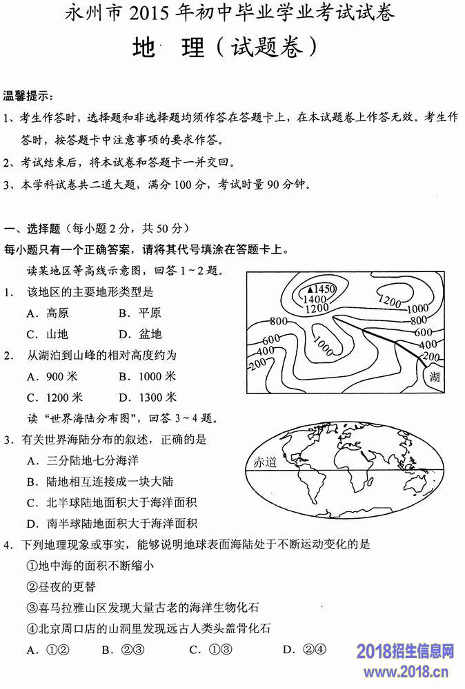 2015湖南永州中考文综地理试题(图片版,无答案)