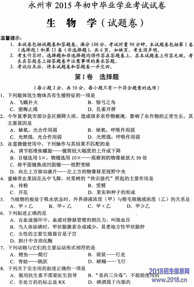 2015年湖南省永州市中考生物试题(图片版,无答案)