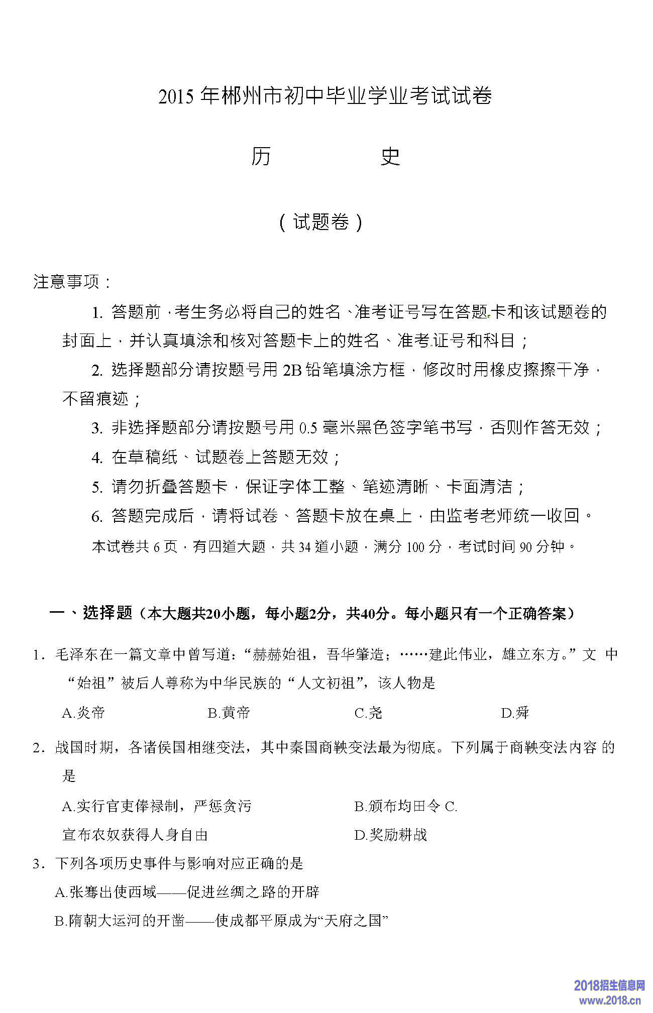 2015湖南郴州中考文综历史试题(图片版)