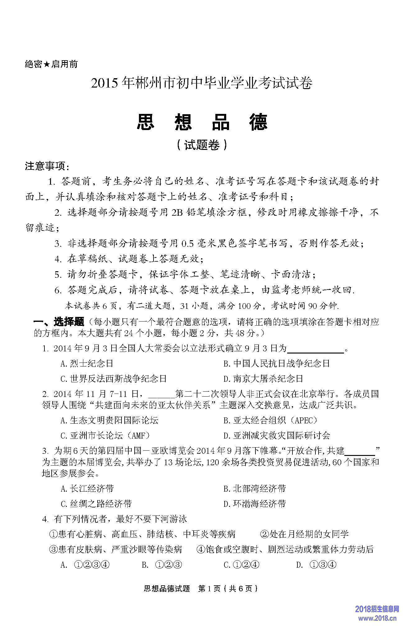 2015湖南郴州中考文综思品试题及答案(图片版)