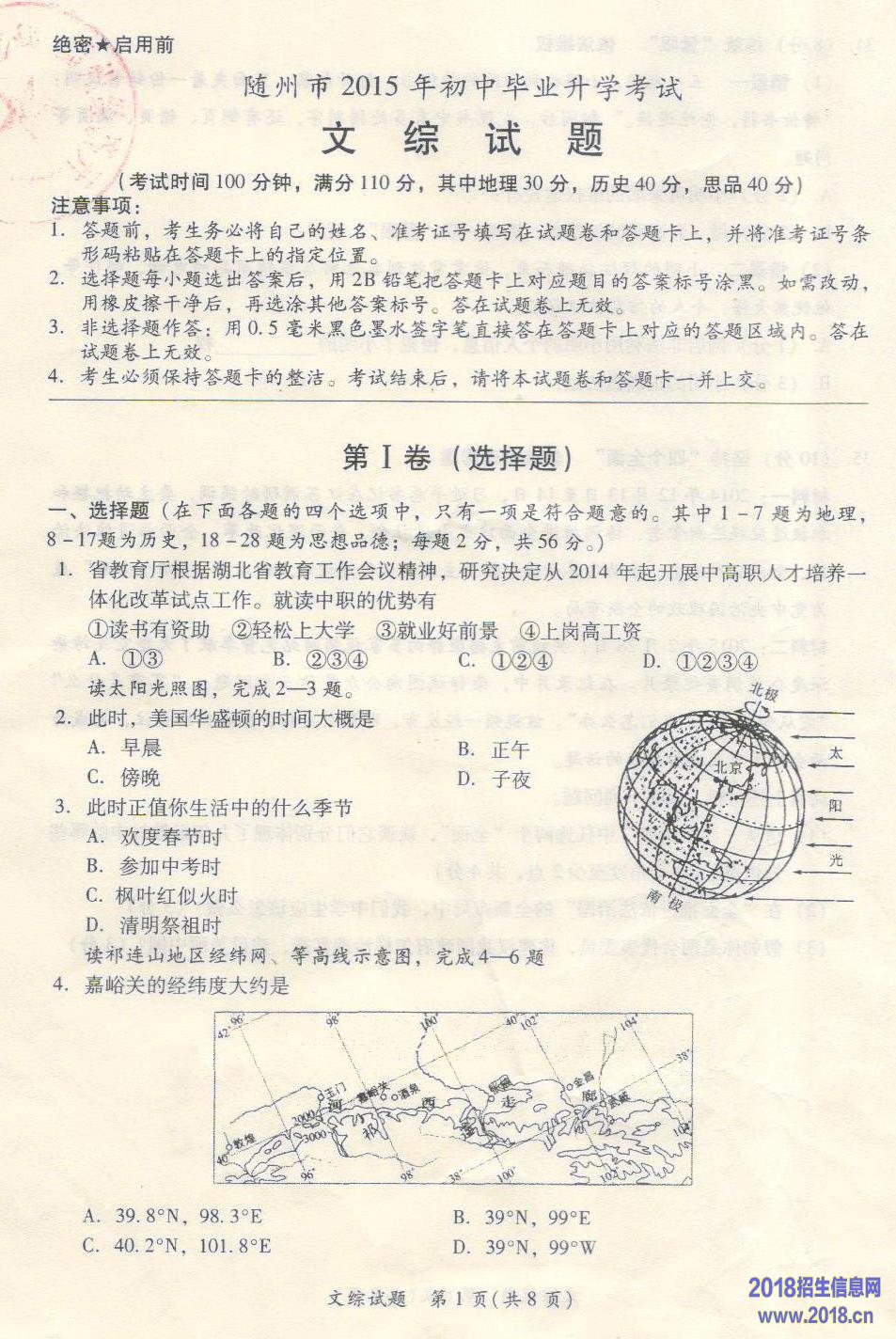 15年湖北省随州市中考文综试题及答案(图片版)
