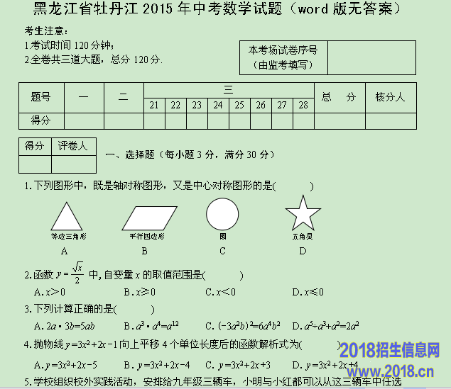 2015年黑龙江省牡丹江中考数学试题(图片版无答案)