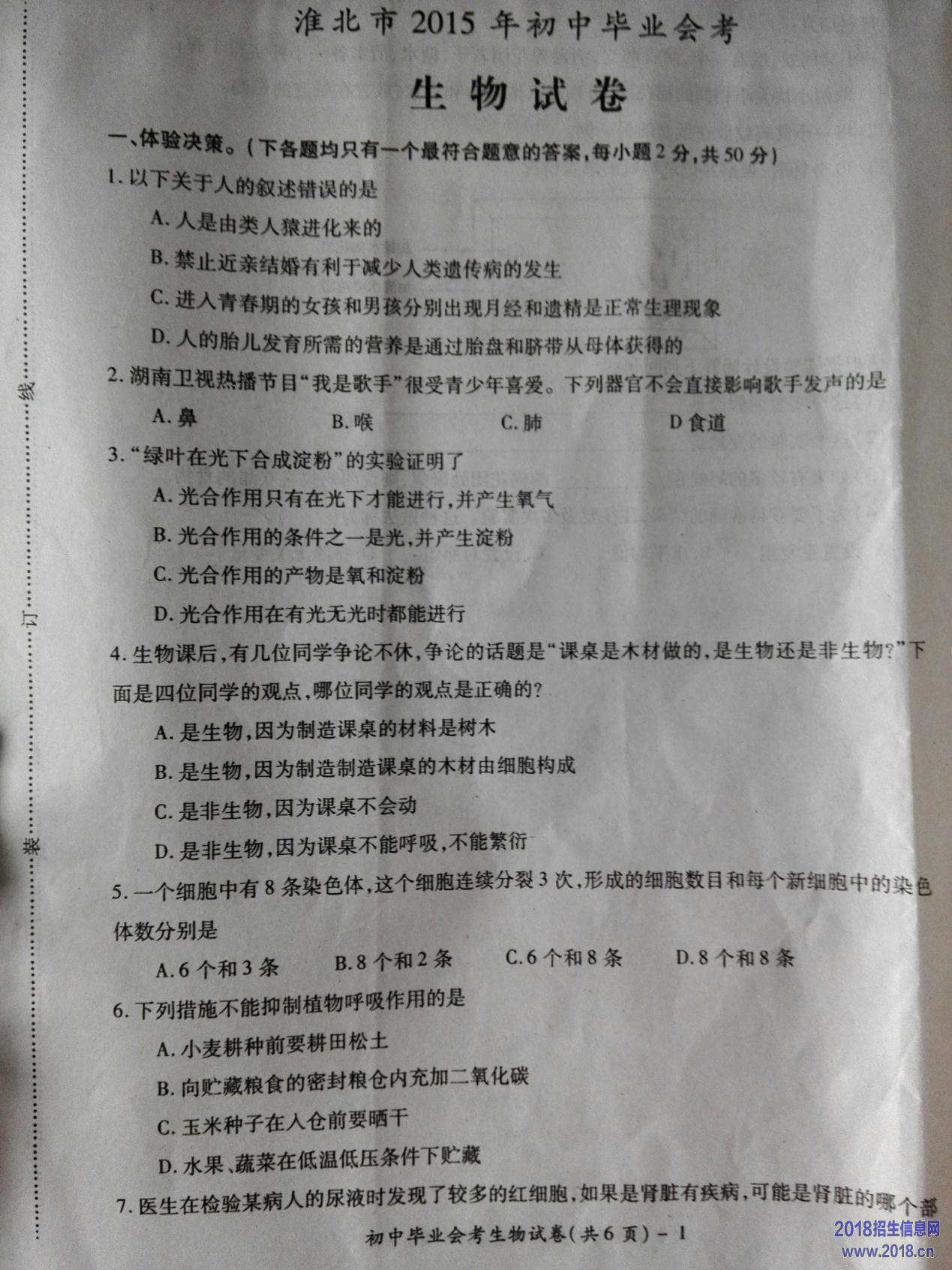 2015年安徽省淮北市中考生物试题(扫描版,含答案)
