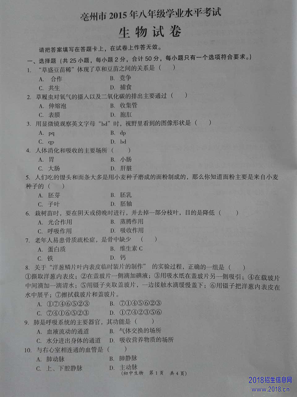 2015年安徽省亳州市中考生物试题(扫描版,无答案)