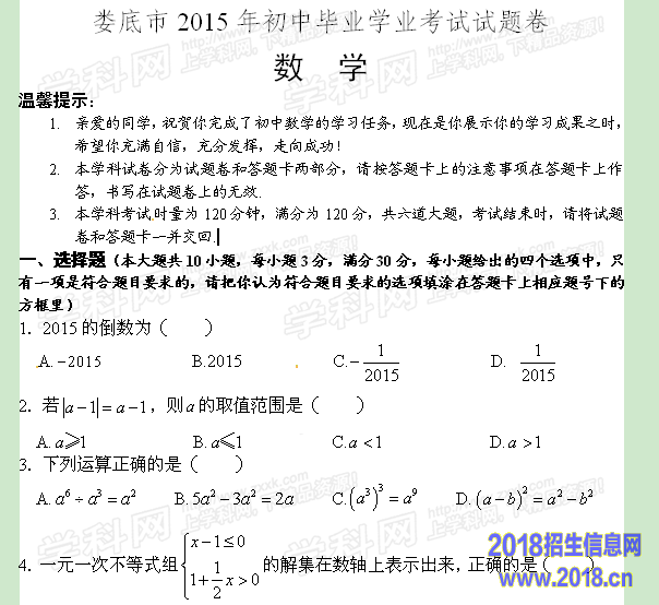 2015年湖南省娄底市中考数学试题(图片版,无答案)
