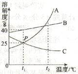 ⑴t2℃时,A、B、C三种物质中溶解度最小的是 。