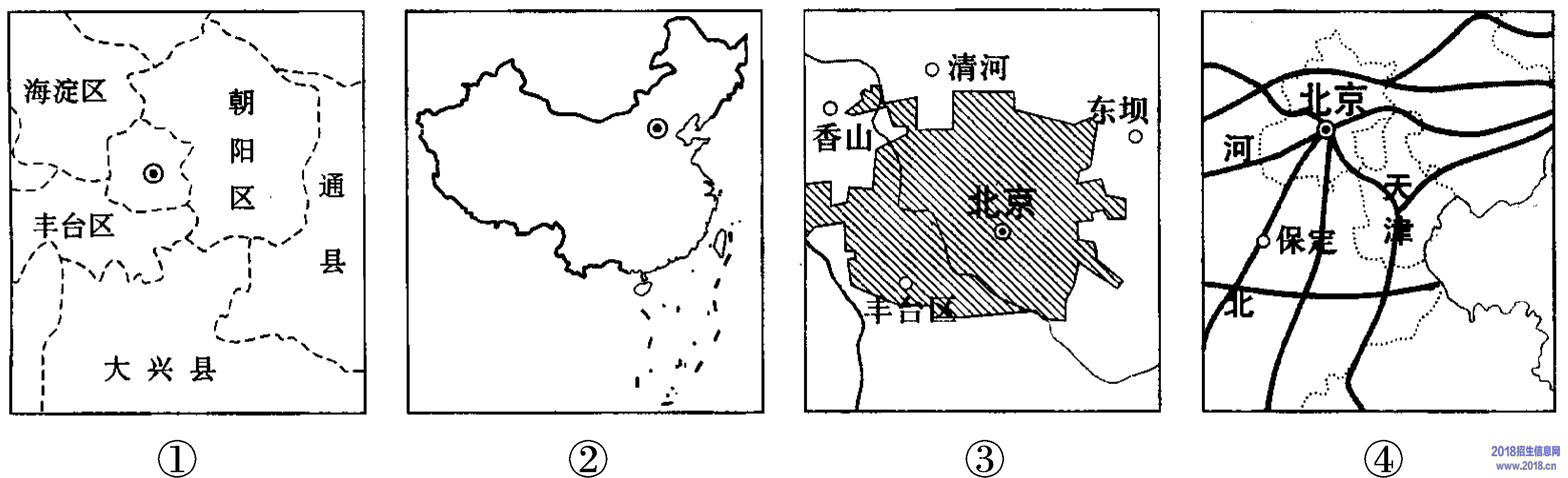 8. 下列表示北京的四幅图中,地图比例尺最小的是