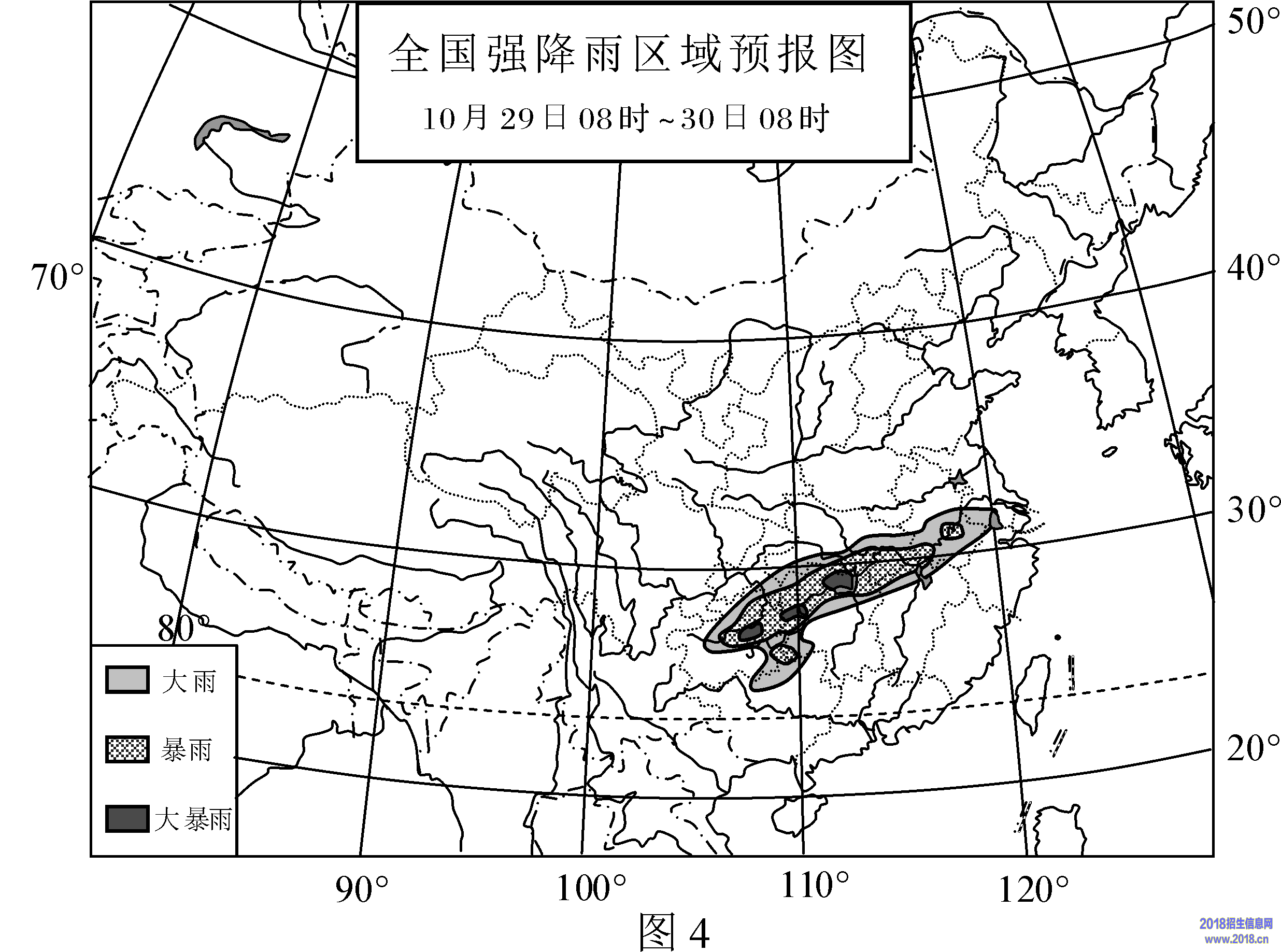 图4是2014年10月29日~30日全国降雨区预报图,读图回答13~14题。