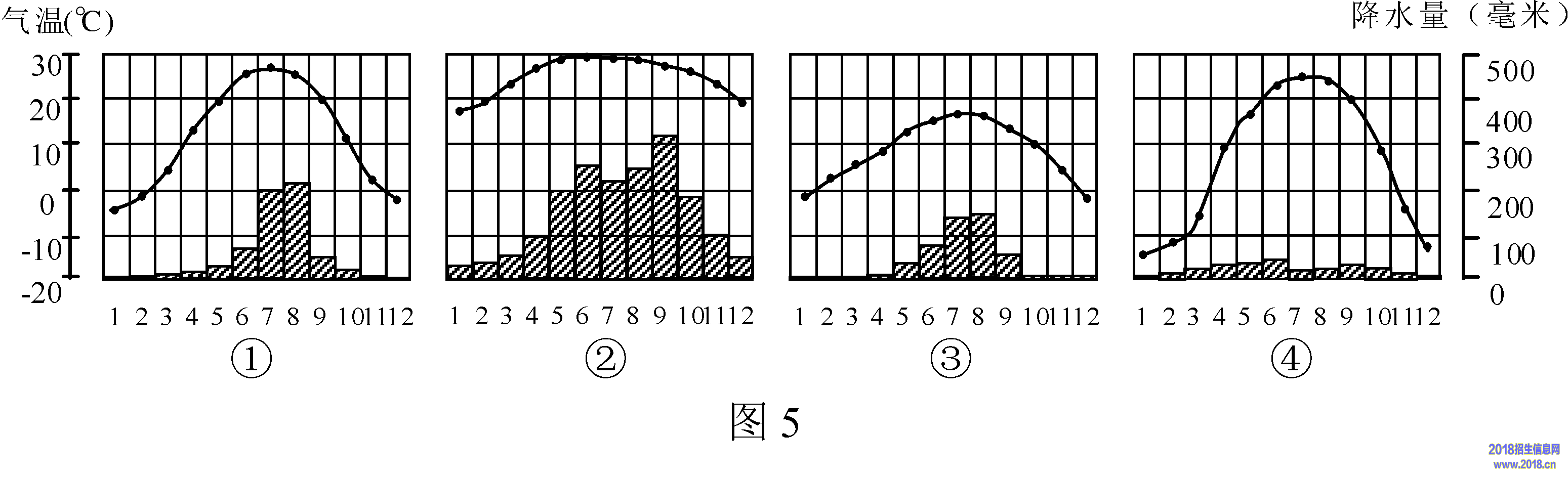 图5是我国四个城市的气温曲线和降水柱状图。读图回答15~16题。