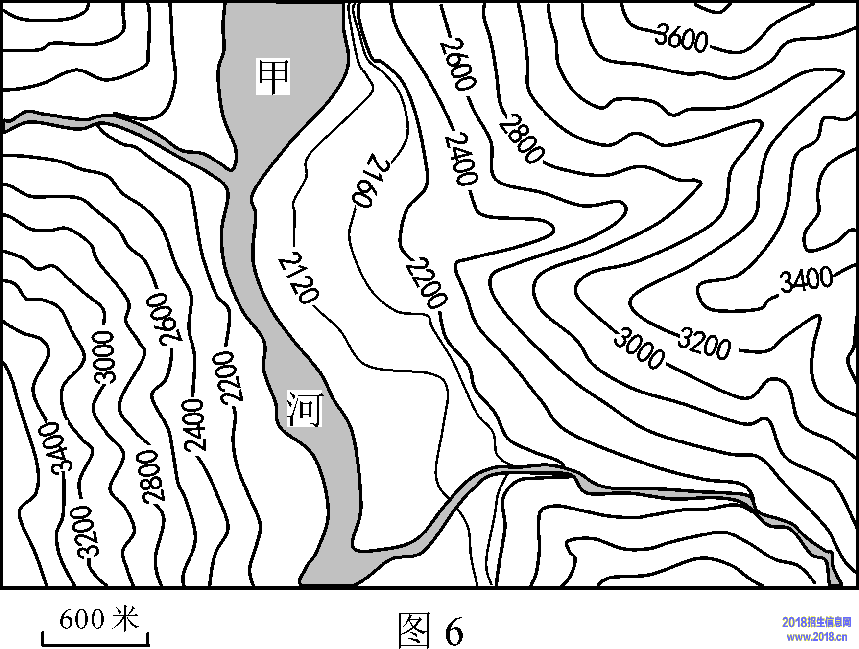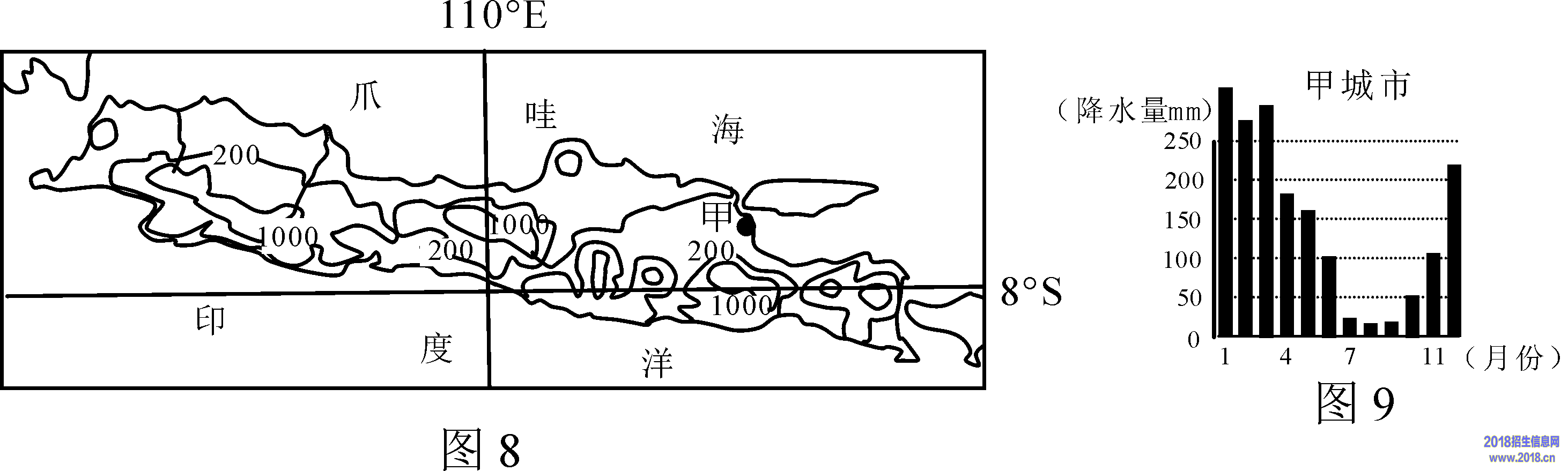 图8是世界某岛屿地形和河流分布图,图9是甲城市降水量分布图。读图回答21~22题。