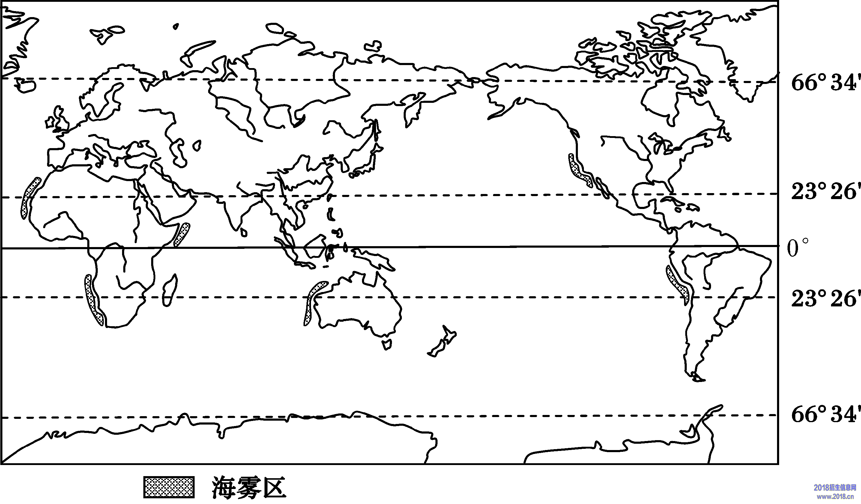 图7中的阴影是世界经常出现海雾(海洋上空的雾)的海区。按纬度大小0°~30°为低纬度,30°~60°为中纬度,60°~90°为高纬度。据此回答19~20题。