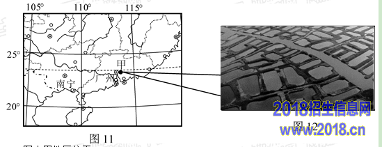 图11是我国南方部分地区图,图12是甲地景观图,读图回答25~26题。