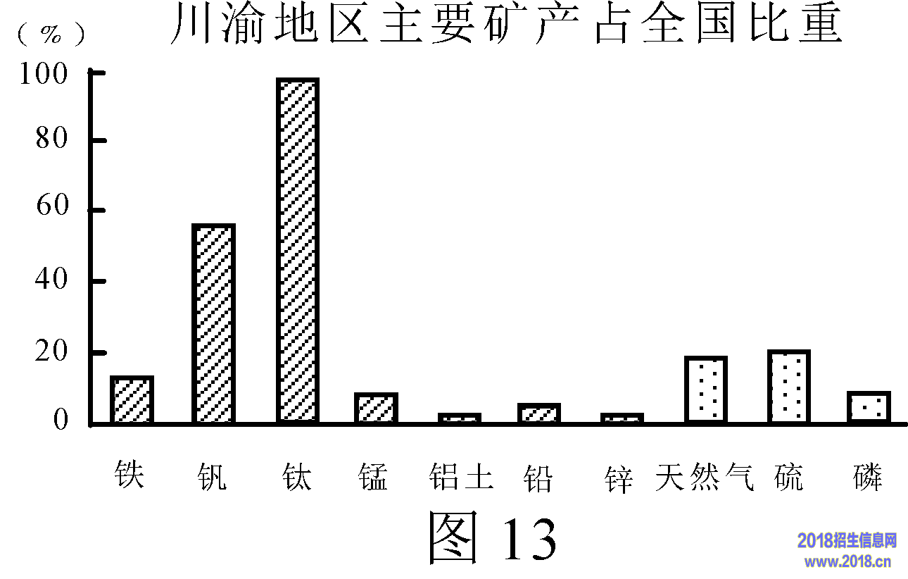 图13是川渝地区主要矿产占全国的比重示意图,读图回答27~28题。