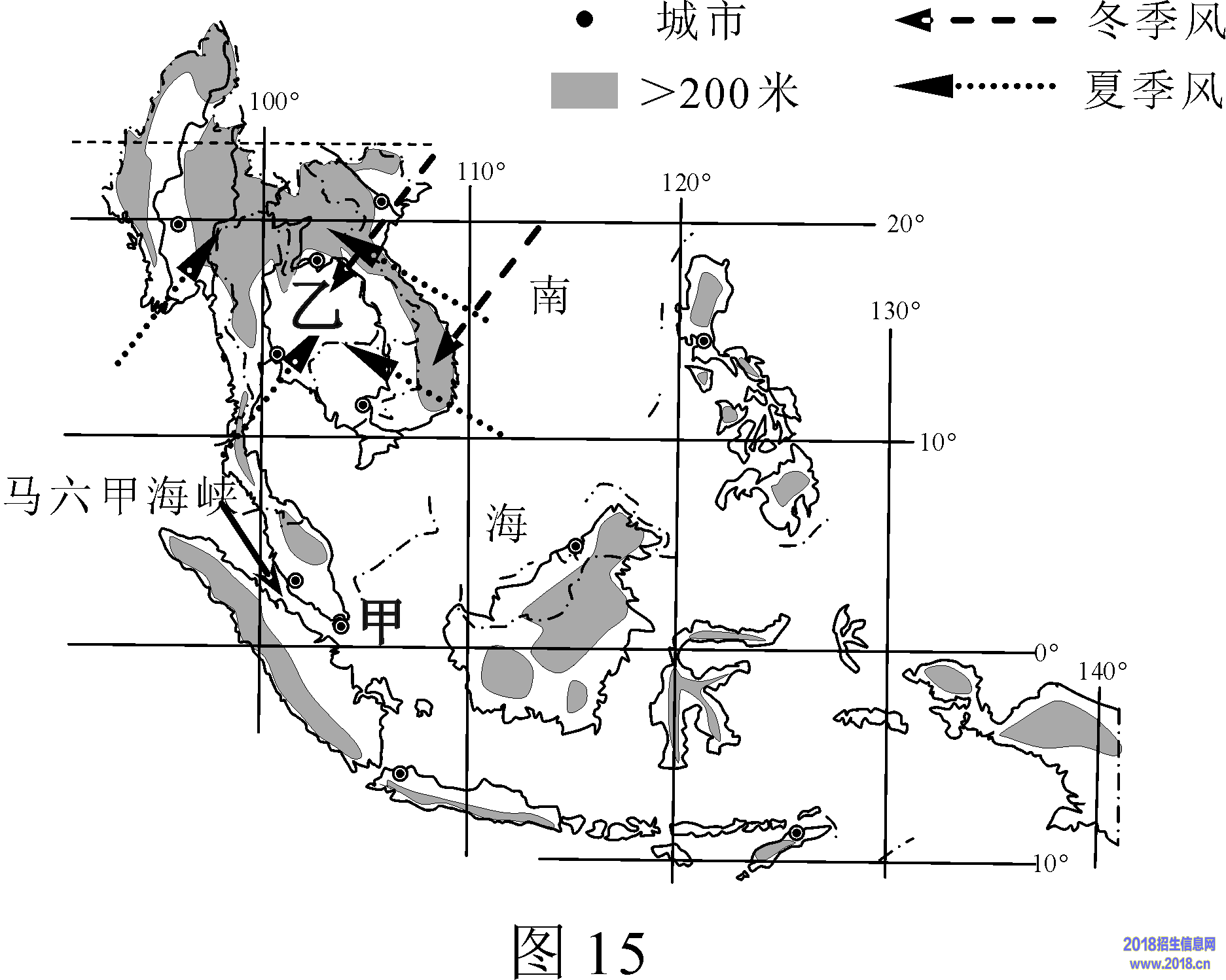 31. 图15东南亚地形和城市分布图,读图回答下列问题。(14分)