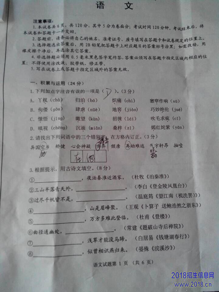 2015年山东省威海市中考语文试题(扫描版,含答案)