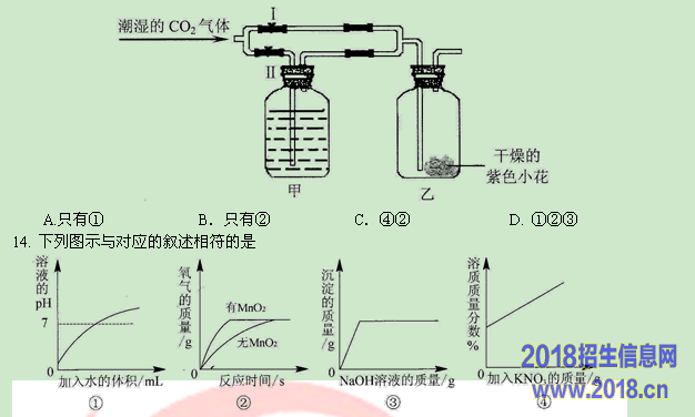 13. 如下图所示:若关闭Ⅱ阀打开I阀,紫色小花(用石蕊溶液染成)变红;若关闭I阀打开Ⅱ阀,紫色小花不变红。则甲瓶中所盛的试剂可能是