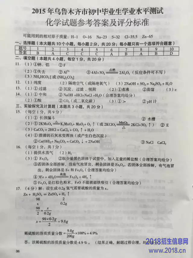 2015年新疆乌鲁木齐市中考化学试题(word版,含答案)