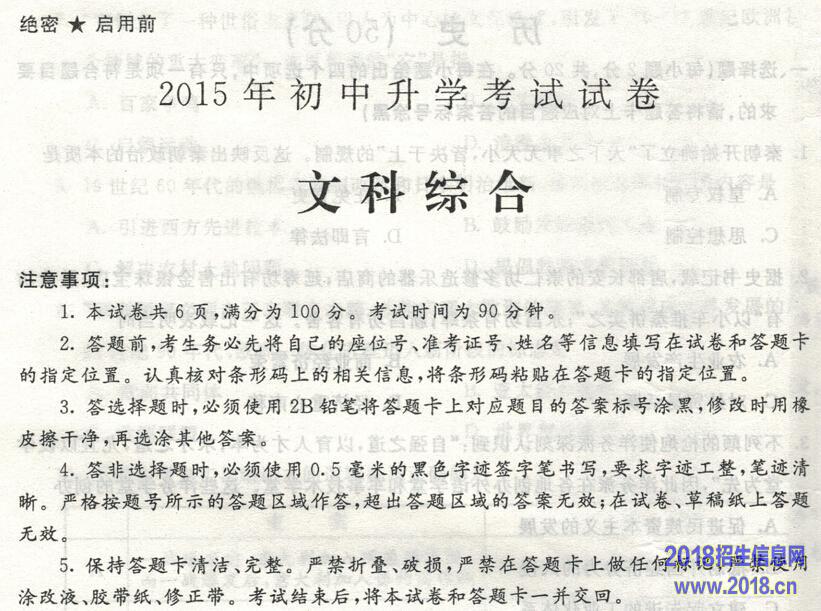 2015年内蒙古包头市、乌兰察布市中考文综(政治部分)试题(扫描版,含答案)