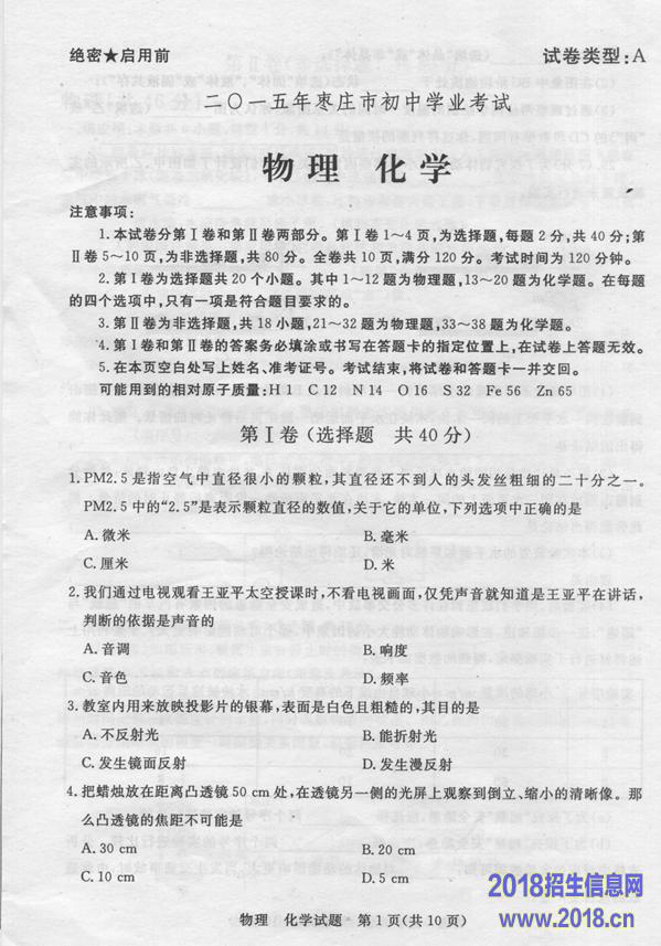 2015年山东省枣庄市中考物理试题(扫描版,含答案)
