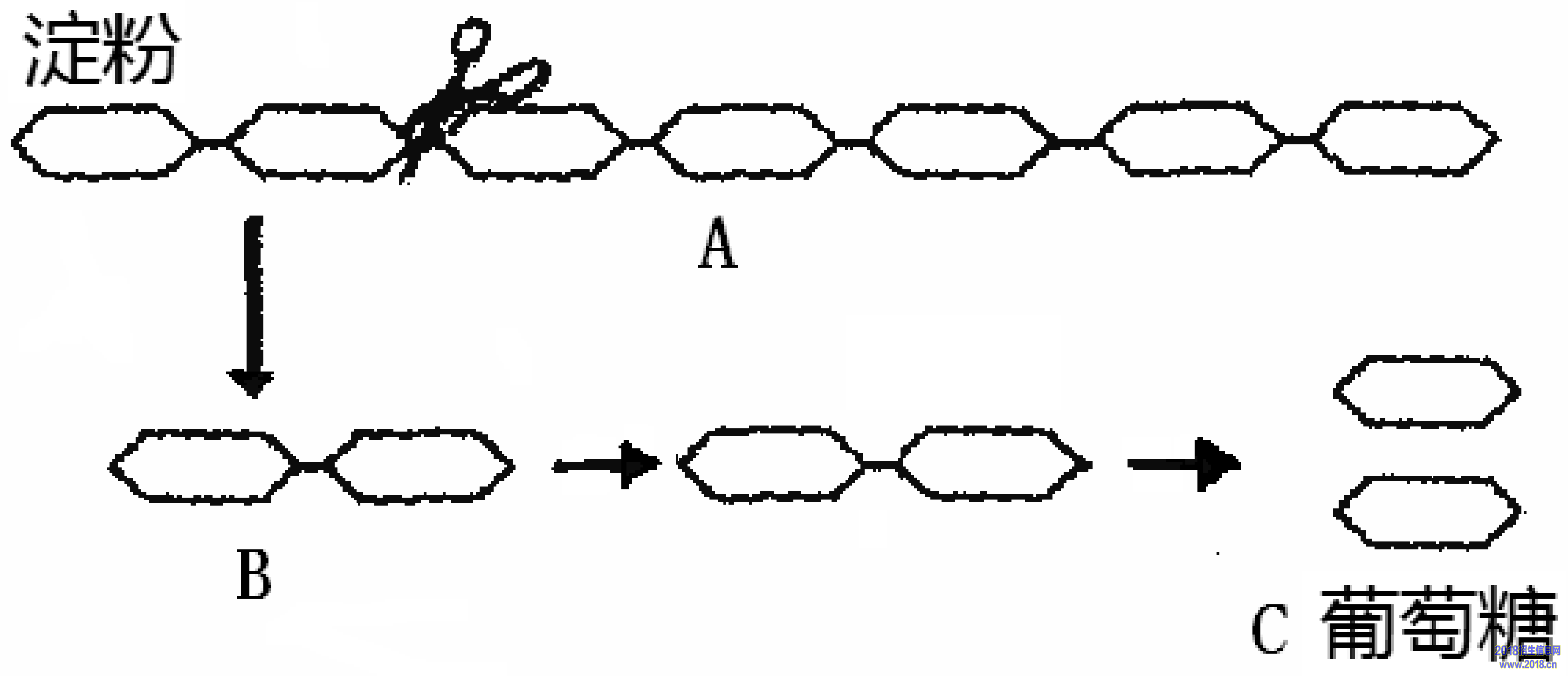 35.右图模拟淀粉在消化道中的消化过程,图中“剪刀”模拟消化液中的 ,图中B代表的物质是 。