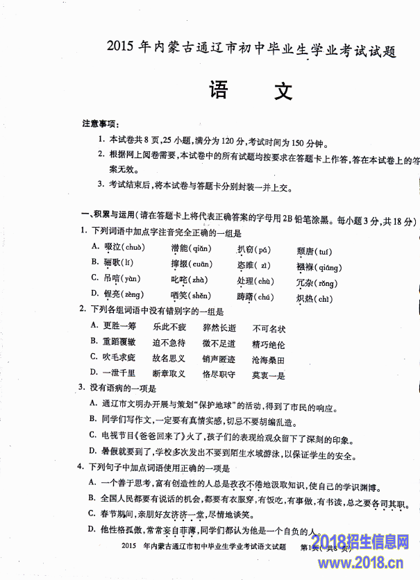 2015年内蒙古通辽市中考语文试题(扫描版,无答案)