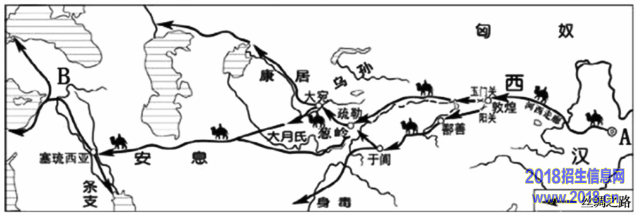 (1)写出材料一中A、B两点分别代表的地方。(4分)结合所学知识指出丝绸之路的重要历史作用。(2分)