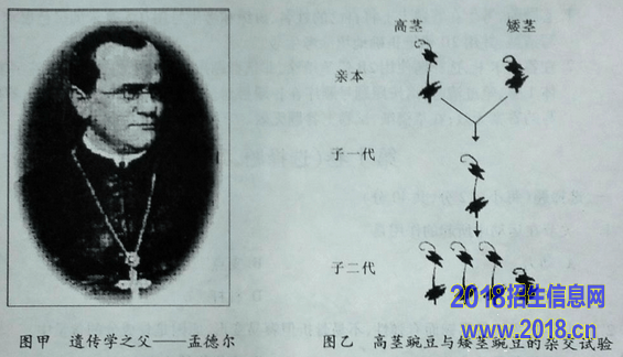 2. (10分)著名的遗传学之父孟德尔(图甲)通过分析豌豆杂交实验的结果,发现了生物遗传的规律。孟德尔将高茎豌豆(基因型为DD)与矮茎豌豆(基因型为dd),发现子一代全为髙茎,子一代自花传粉获得的子二代既有髙茎(如图乙所示)。请分析回答: