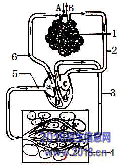 28.(7分)右图为人体血液循环简图,其中代码A、B分别表示肺与外界的气体交换方向,a、b、c 、d表示心脏的四个腔,1-6表示有关的血管,请分析回答: