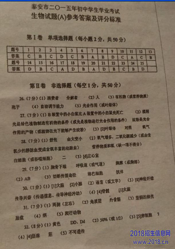 2015年山东省泰安市中考生物试题(word版,含答案)