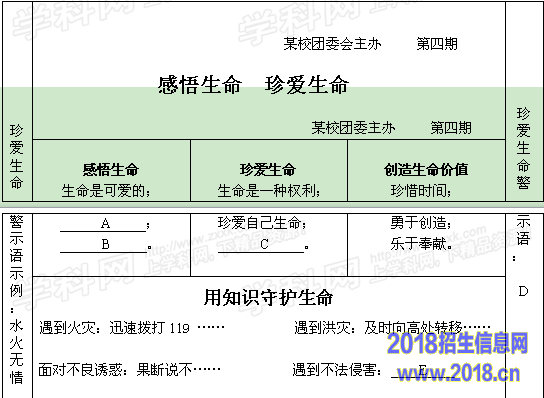 温馨提示:请你按照要求完成A、B、C、D、E、F处内容。【A、B、C处完善主要栏目内容(各2分);D处设计一条珍爱生命警示语(2分);E处填写应对措施或办法(3分);F处运用所学知识,结合主题,写一段生命感言作为编后语。(3分)】