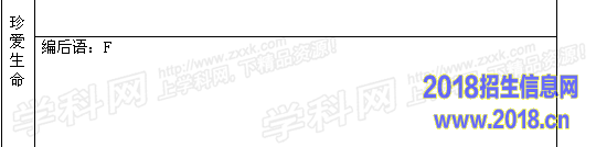29.(14分)A:生命是可敬的(2分) B:生命是可贵的或者生命是神圣的等(2分) C:尊重他人生命(2分) D:生命在于运动;珍爱生命,请勿吸烟;珍爱生命,远离毒品等(2分)E:及时报警;学会请律师;寻求法律援助;勇于并善于同不法侵害做斗争(正当防卫、呼救、逃跑、记住不法侵害者的面部特征和逃跑的方向)等(3分) F:生命感言。(围绕主题,从让更多人懂得生命的可贵;学会尊重自己和他人生命;努力提升生命的价值等内容作答。其它言之有理可酌情记分)。(3分)
